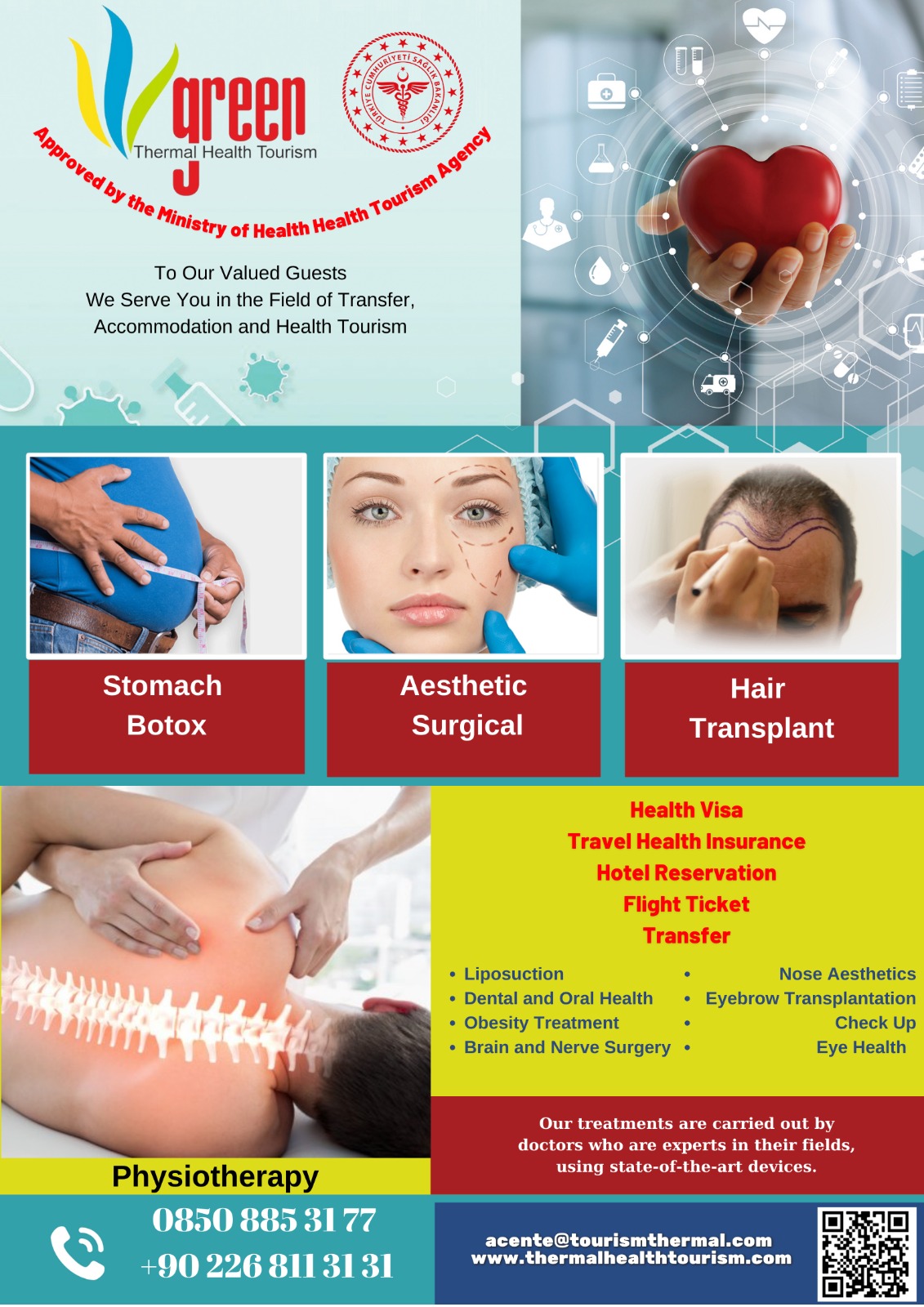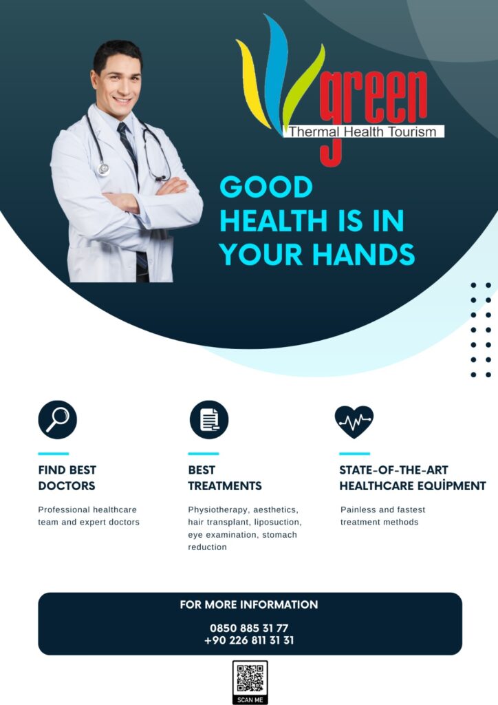 Green Thermal Tourism obtained its International Health Tourism license in 2021. As the holder of this international health tourism license, we are taking steps to establish a physiotherapy center at our GREEN THERMAL HOTEL, which will utilize the healing properties of thermal water. We also provide outpatient physical therapy, physiotherapy, hair transplantation, aesthetic treatments, and obesity surgery services to our foreign guests. With a strong presence in Middle Eastern tourism, our company is striving to be the best in the region. Through our travel services offered to clients from Dubai, Kuwait, Saudi Arabia, Oman, Qatar, and Bahrain, we showcase Turkish hospitality and the beauty of the country in the best possible way.